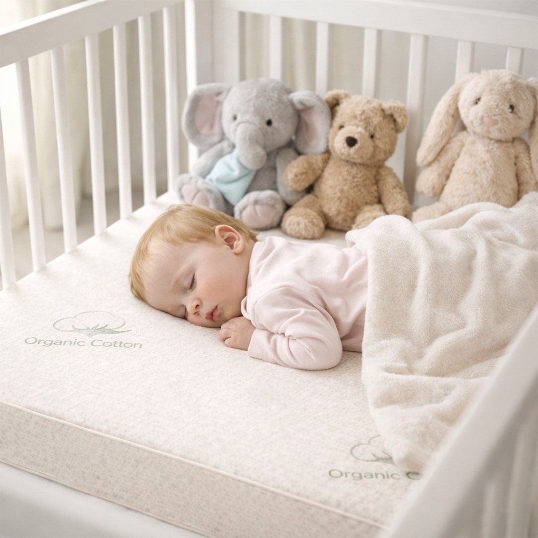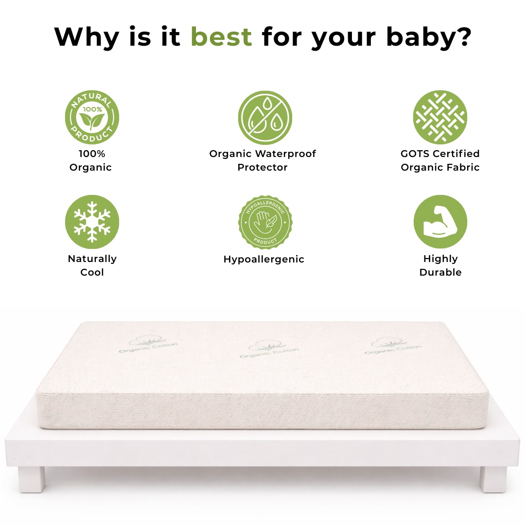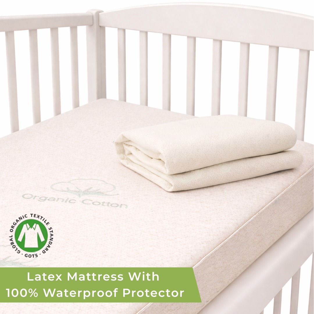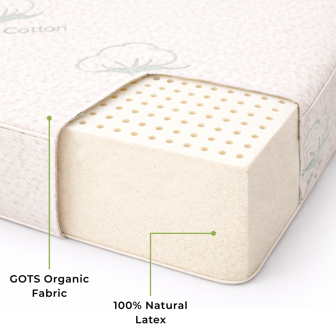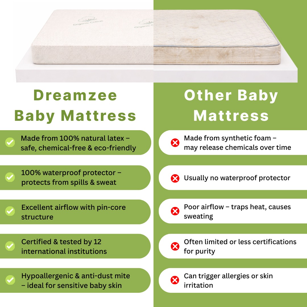 Give your baby the safest and most natural start to healthy sleep with the Dreamzee 100% Natural Latex Baby Crib Mattress. Thoughtfully designed for infants and toddlers, this mattress features a pure natural latex core that provides firm, orthopedic support essential for proper spinal development. Unlike synthetic foam mattresses, natural latex is breathable, temperature regulating, and free from harmful chemicals or toxic smells, creating a cleaner and healthier sleep environment. The mattress is naturally hypoallergenic and resistant to dust mites, mold, and bacteria, making it ideal for babies with sensitive skin. Wrapped in soft GOTS certified organic fabric and paired with a FREE waterproof, noiseless mattress protector, it ensures both comfort and easy protection against spills and diaper accidents. With its perfect fit for standard cribs. Dreamzee offers parents peace of mind and babies the gentle, supportive sleep they deserve.