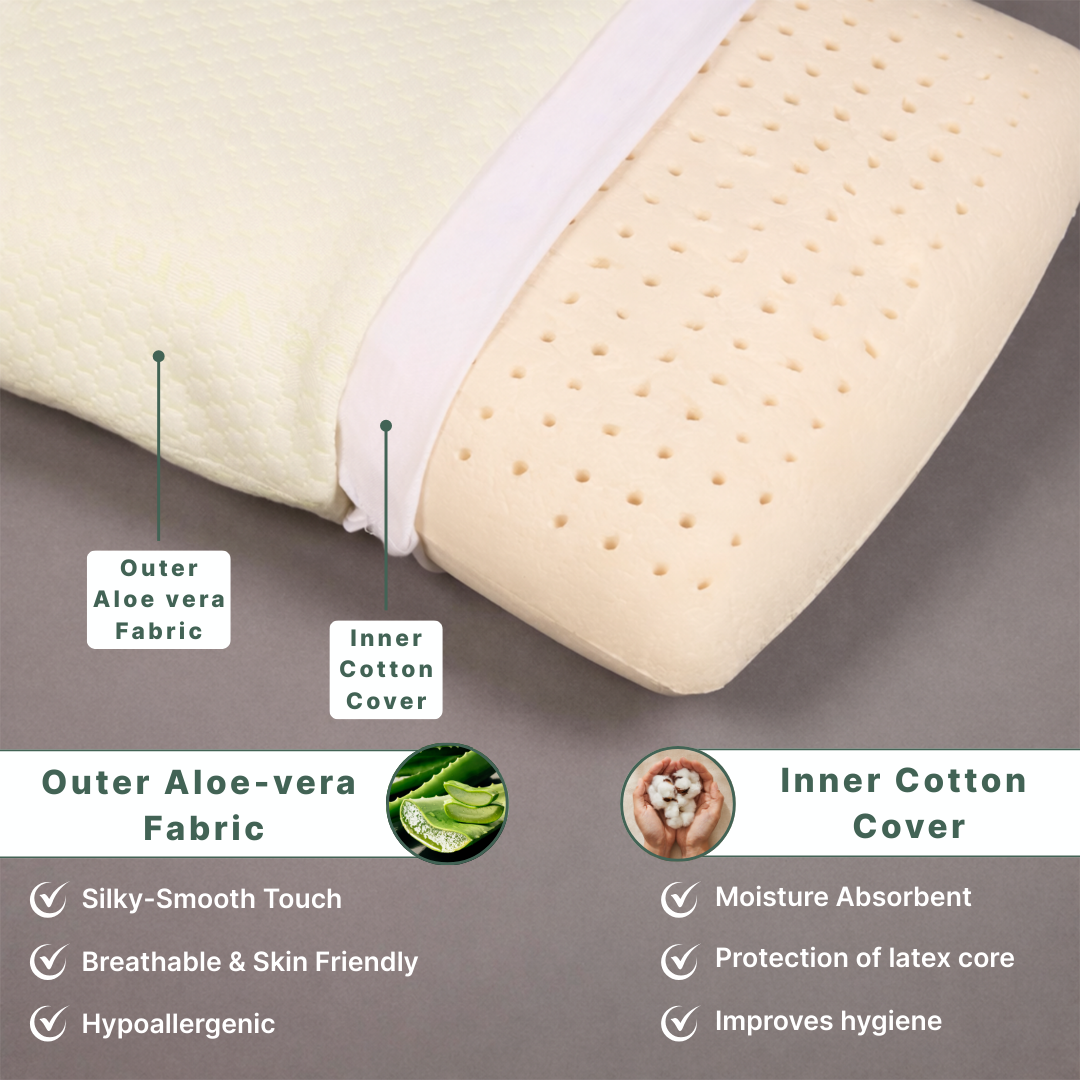 Aloe-vera fabric in this latex pillow offers a soothing, natural touch that enhances comfort. Infused with aloe vera, it provides antibacterial, moisturizing benefits, and gentle softness, making it ideal for restful, skin-friendly sleep.